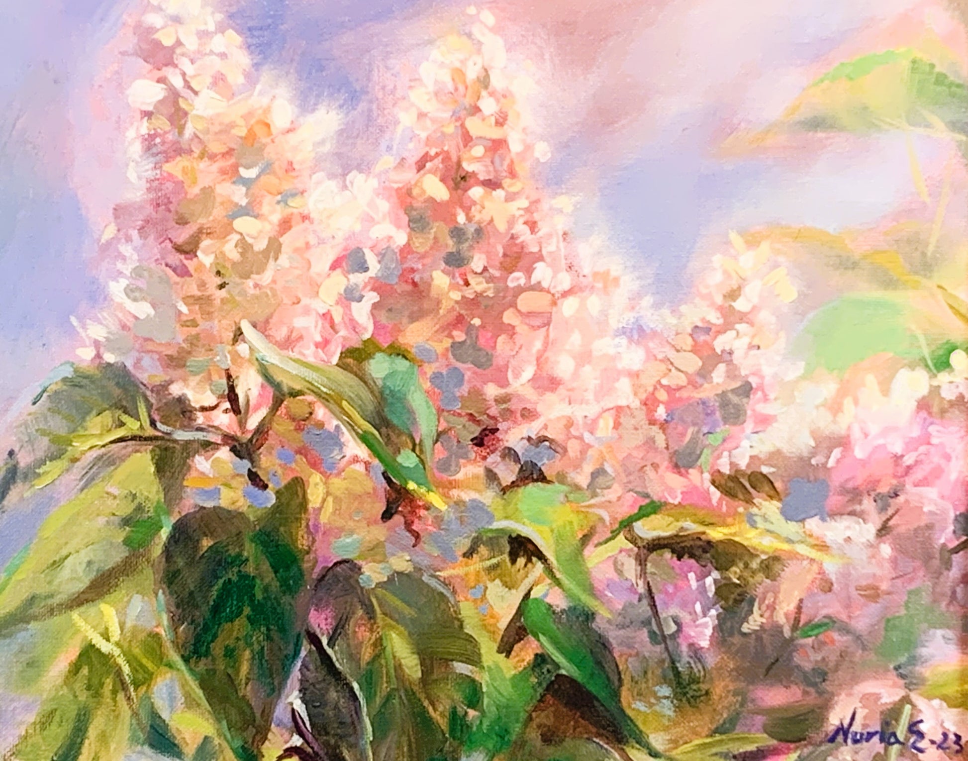 A plein air painting done on a beautiful sunny day at the Arboretum at the Royal Botanical Gardens, when the lilac trees were in full bloom and the air had their sweet perfume.