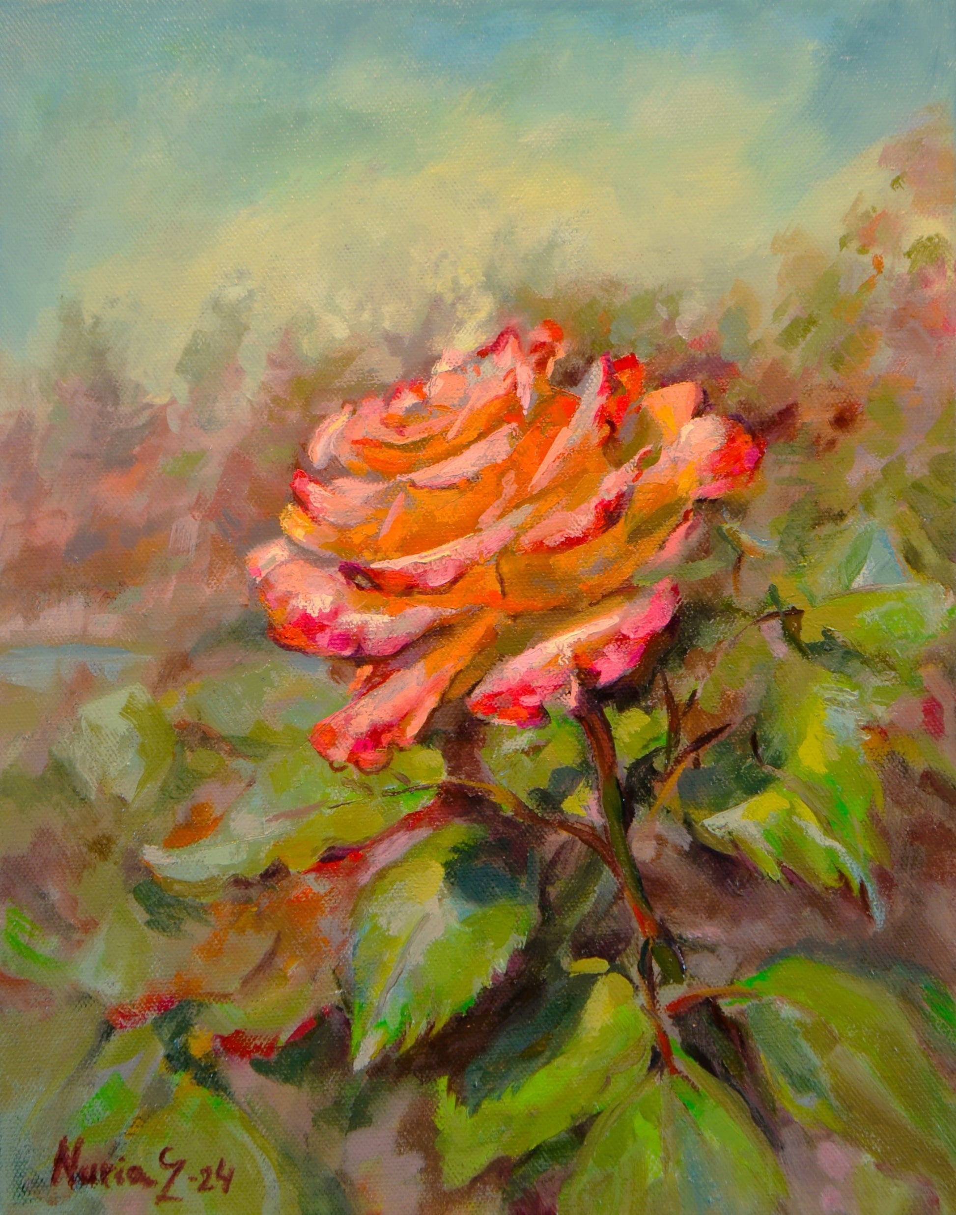 A radiant rose standing out among all the greens in the landscape on a sunny summer day in southern Ontario.