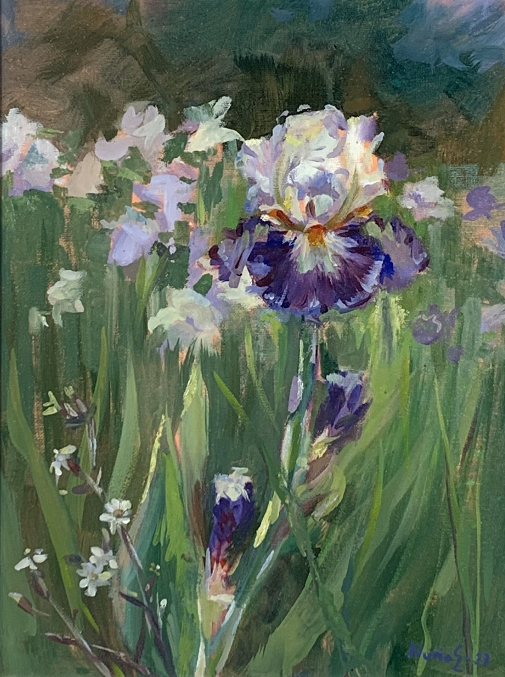 A beautiful garden full of irises on a hazy day, I focus in on one of them for its complementary colors, blues and oranges.