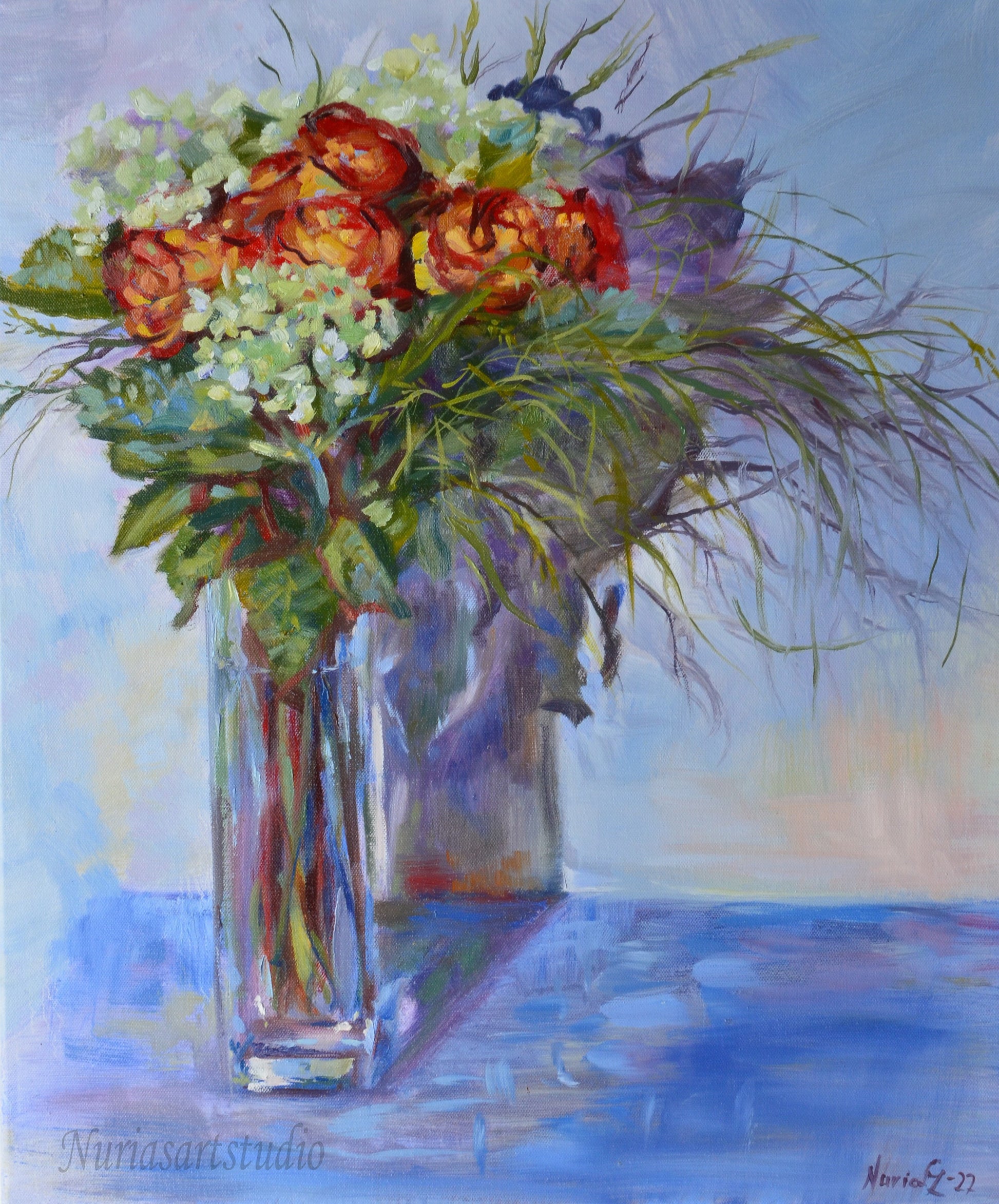 A colorful still life bouquet on a glass vase. I really enjoy painting these beautiful two-color roses where the red challenges the green of the leaves and the light green of the hydrangeas.