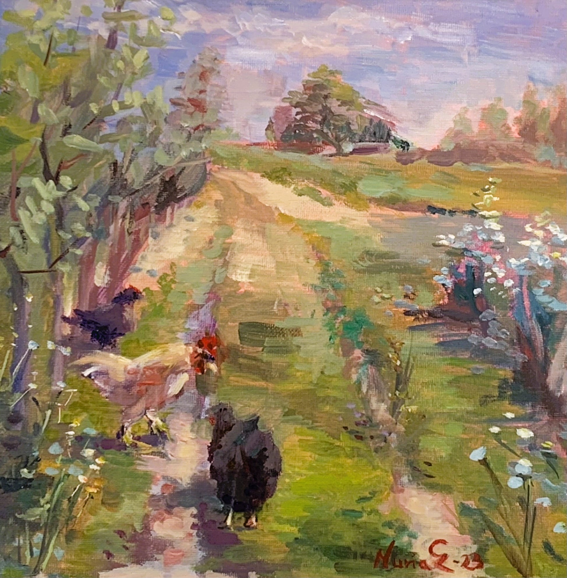Plein air painting done at an alluring Cider Farm with their apple trees, chickens, lambs....at Freelton, Ontario.