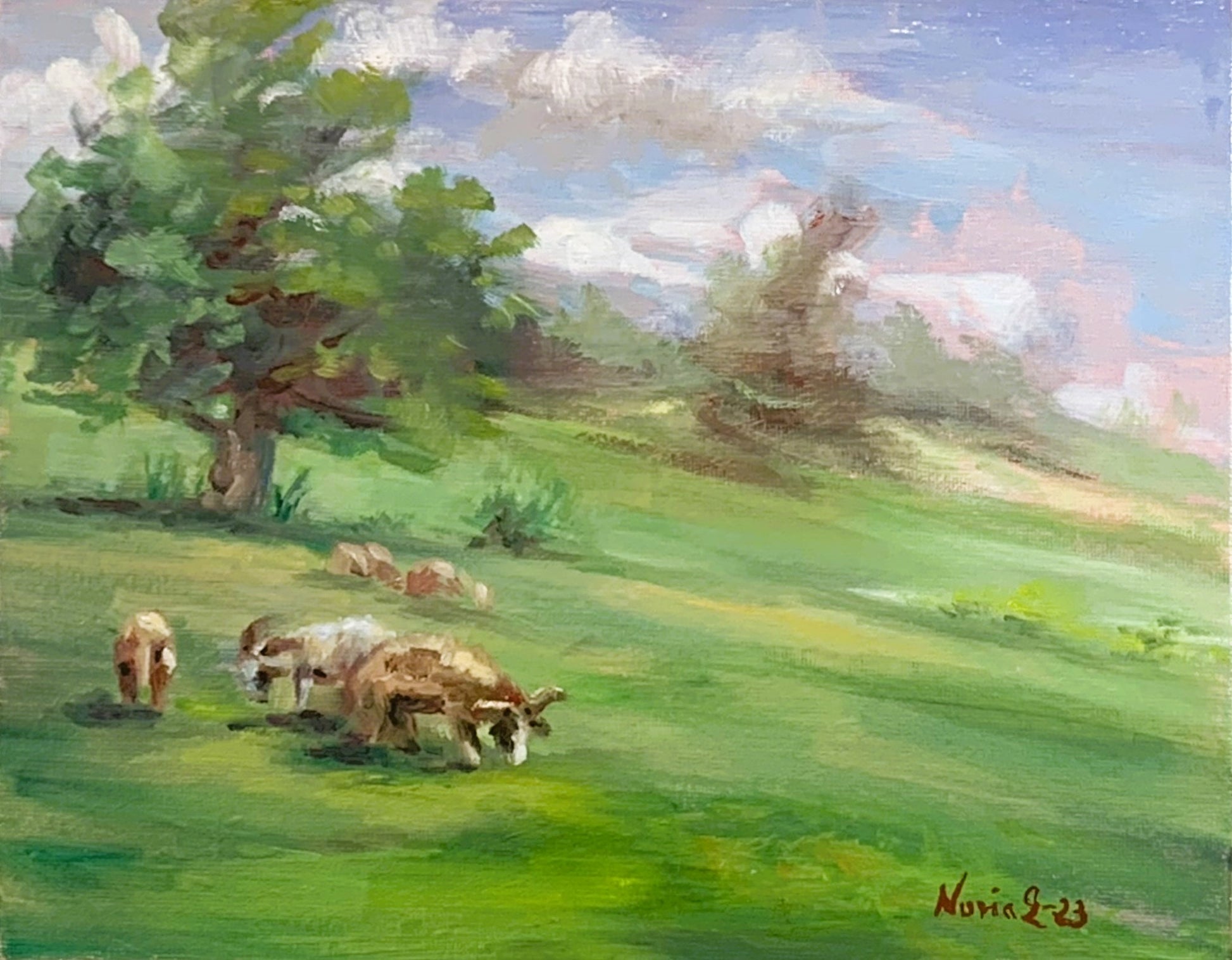 Plein air painting done at an alluring Cider Farm with their apple trees, chickens, lambs....in Freelton, Ontario.