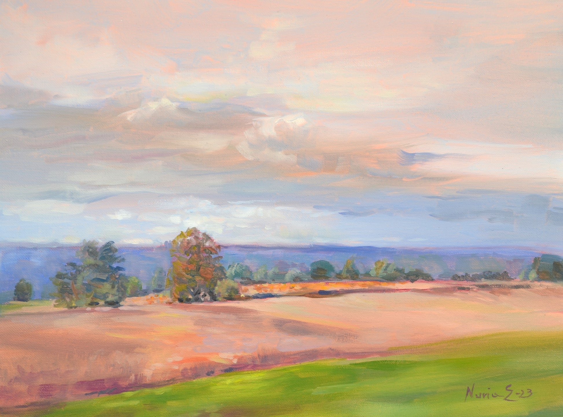 Plein air painting done in Autumn, when the beautiful warm oranges appear all over the fields of southern Ontario.