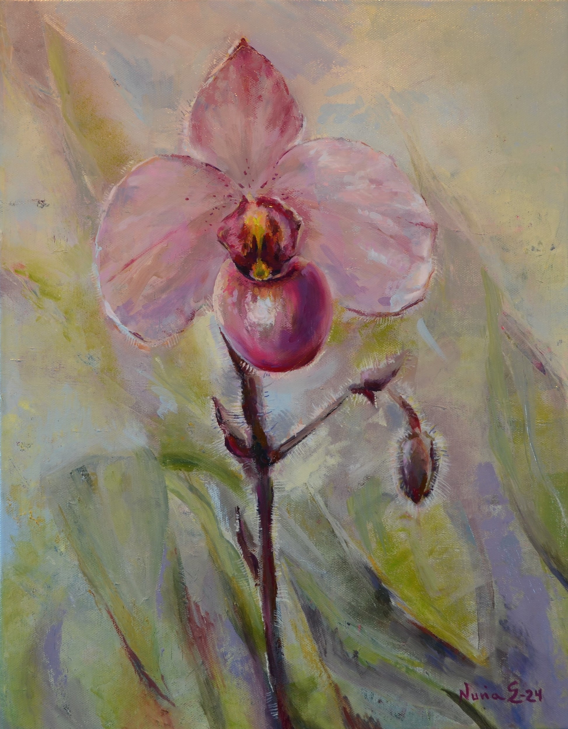 This painting is all about the lovely pink lady’s-slipper, or moccasin flower, a perennial orchid that its name comes from its pink, hollow, pouch-shaped flower, which looks like a slipper.